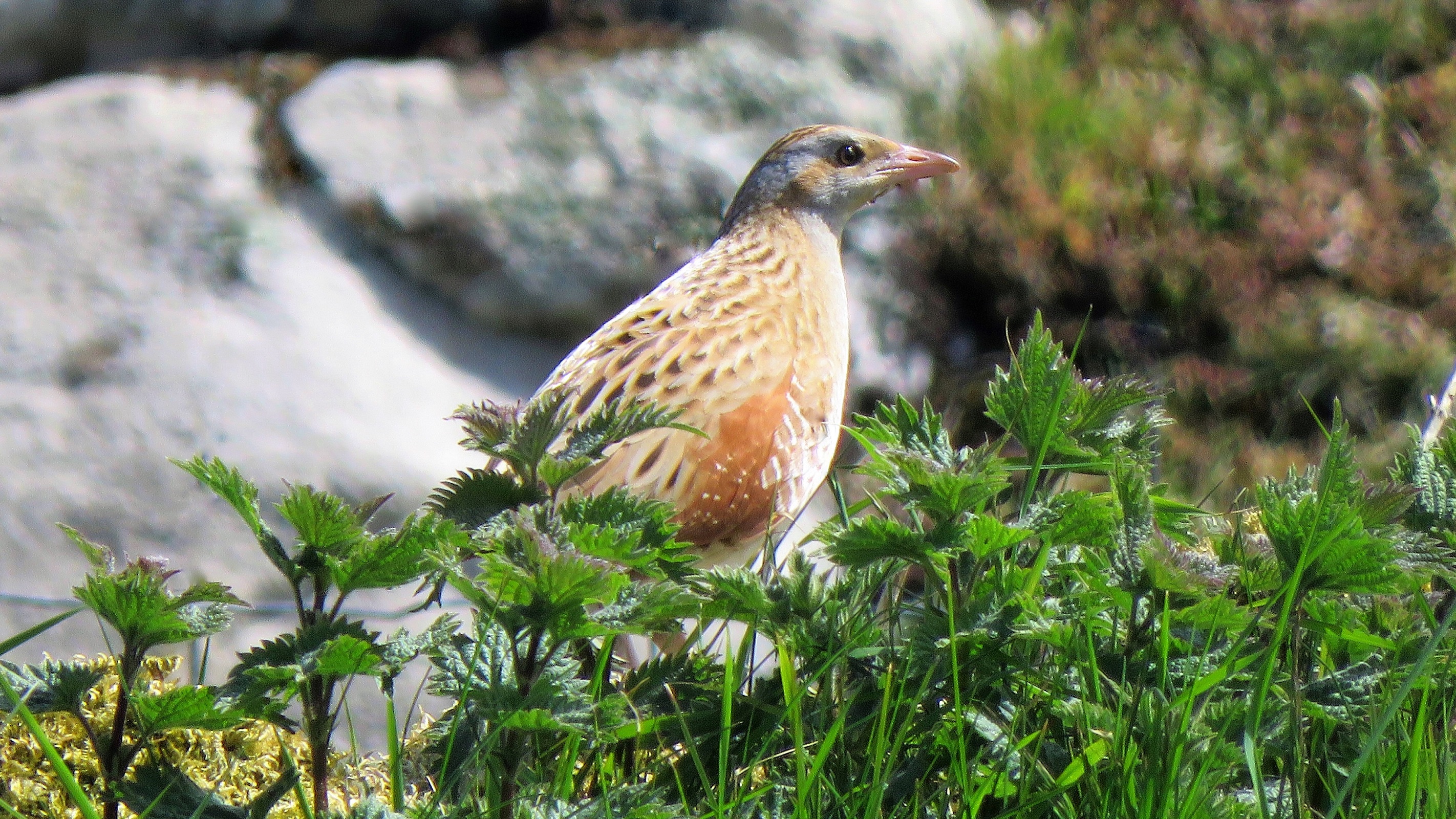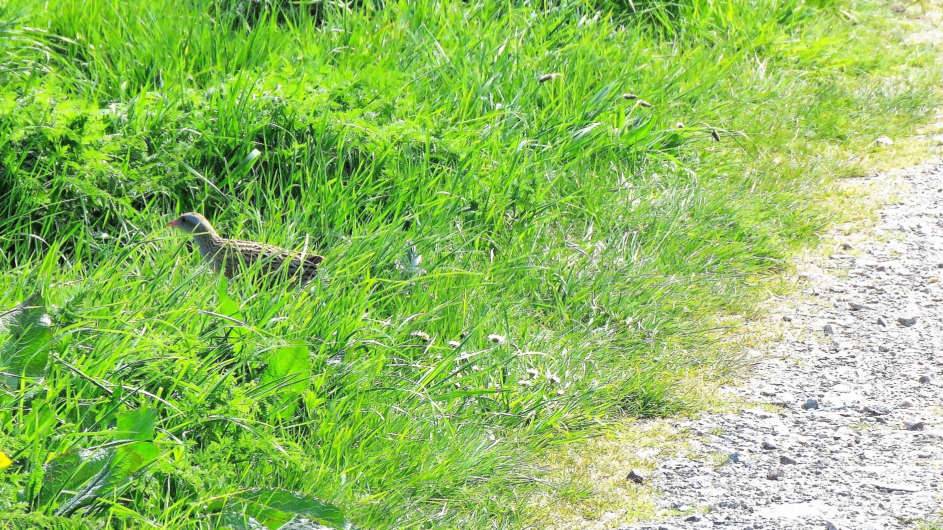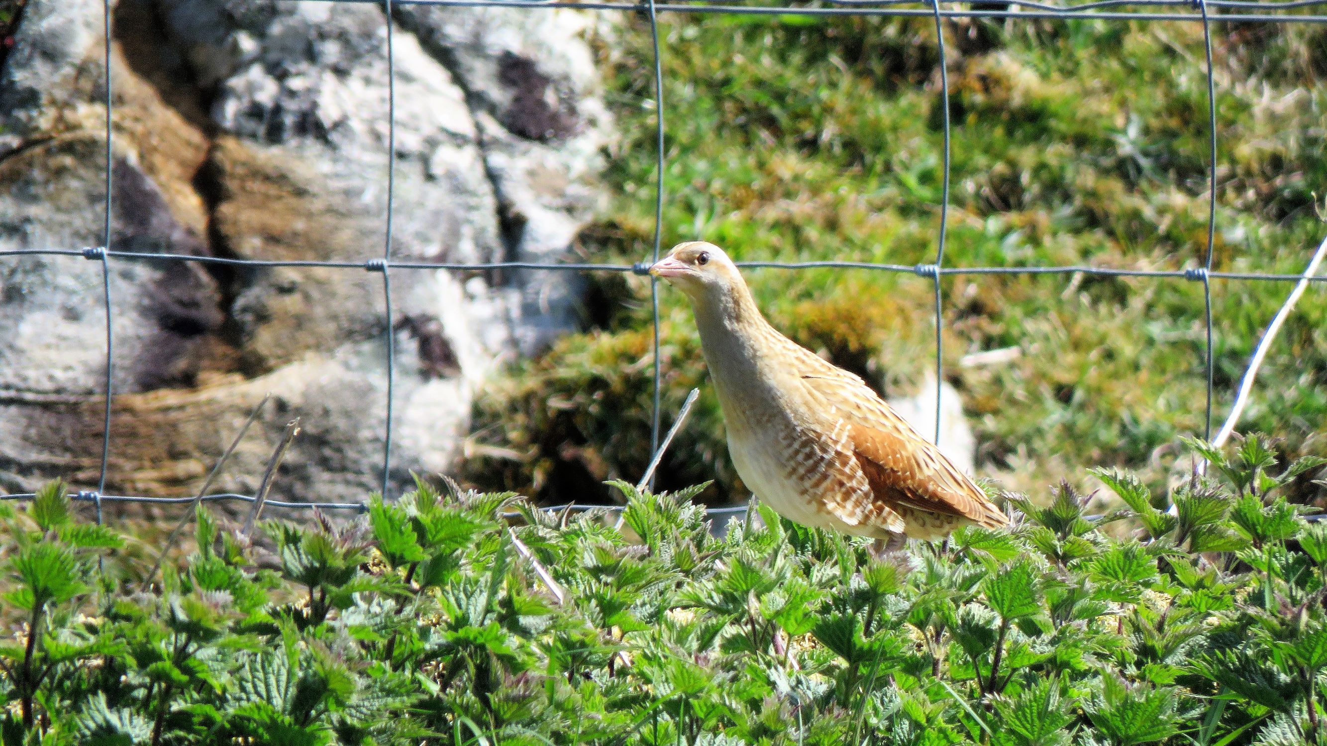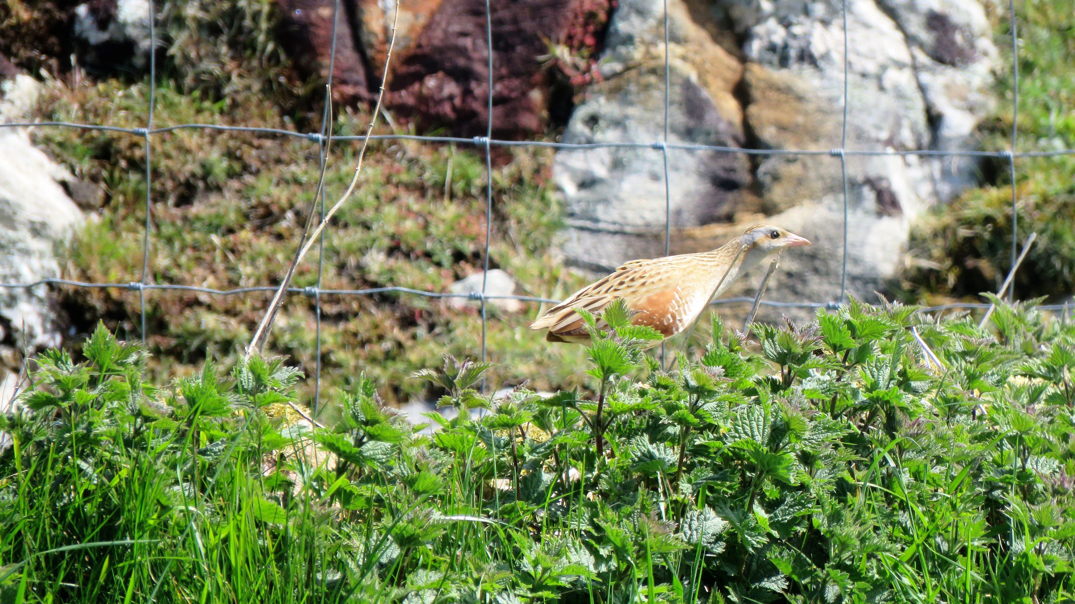 Why so elusive? In part, it’s down to the height of the vegetation they nest in. Within a few weeks of the birds’ arrival in mid-April, the rough grassland, nettle beds and irises are as high as a corncrake’s eye and, very quickly, they disappear from view. It’s this, coupled with their remarkable reluctance to fly more than a couple of metres once they’re on their breeding grounds – as if, having migrated 7,000 miles from equatorial Africa to flop down in a Hebridean nettle bed, they think “Blowed if I’m doing that again!” Sarah and I had a similar reaction after we ran a half-marathon a few years back!