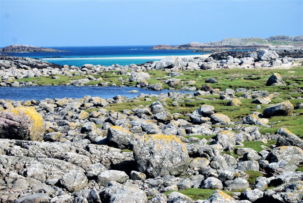 Greg explained that the rocks themselves bear the scars of the last ice age. Over the past two million years, huge layers of slowly moving ice gave Coll its flat, rolling character, dumped huge boulders (known as erratics) on hill tops, and left parallel score marks in the rocks.