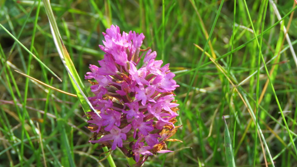 Our final venture into the sand dunes was rewarded with a veritable chorus of unassuming Frog Orchids (is that the right collective term?) and also a late Pyramidal Orchid. These led us into a conversation about the importance of management, like grazing or cutting, to keep the grassy sward open. This prevents the grassy thatch becoming too thick, enabling wild flowers to proliferate.