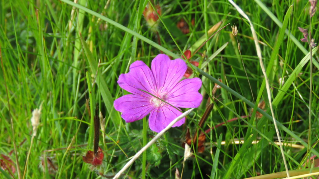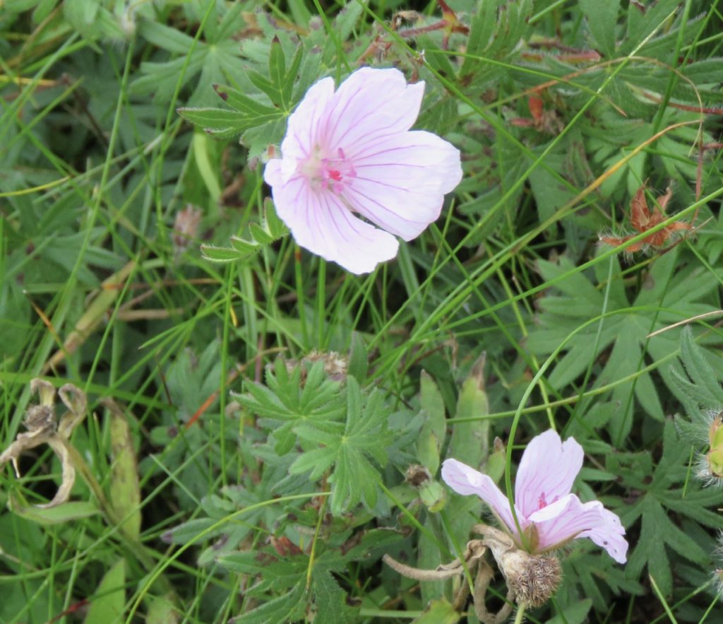 Our walk began in the dunes where we saw the (by now) familiar Bloody Cranesbill, a relatively scarce plant in Scotland and one we primarily associate with limestone country in England. Here on the Coll dunes the shelly sands are highly calcareous and freely draining, and so provide ideal conditions for this lime-lover. The first part of its name comes not from its ubiquity (“Look! There’s more of that bloody cranesbill!”) but from the crimson hue of its stems and fruits. We occasionally find a delightful variant with delicately-pencilled, pale pink flowers.