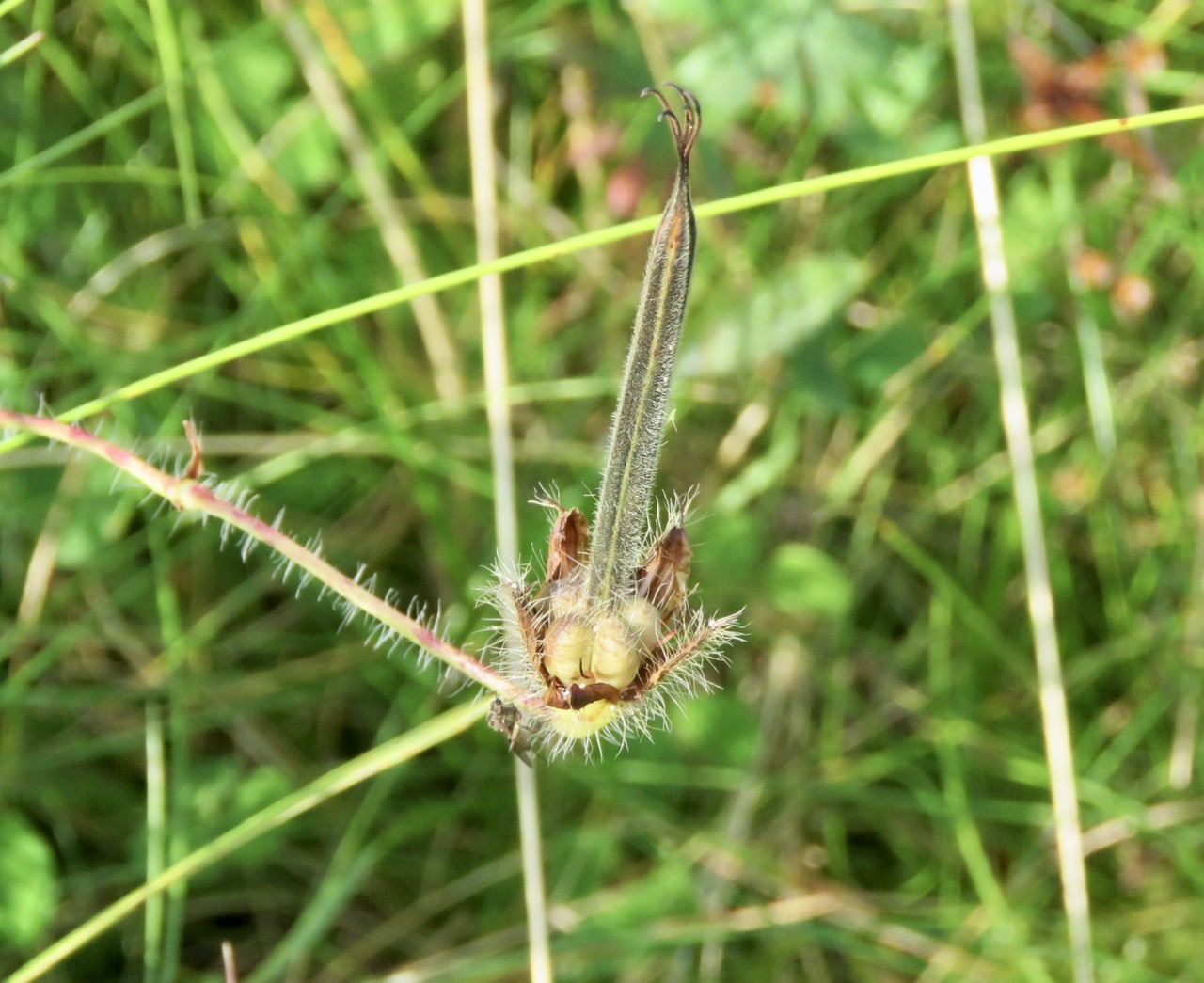 At this time of year though, the architecture of the fruiting bodies comes into its own. At first, the five developing seeds are held at the base of a long spike, which gives rise to the name ‘cranesbill’ for its resemblance to the distinctive head and bill of a crane. Later, the whole structure unfurls and the now mature seeds are lifted aloft on individual arms resembling a candelabra. The purpose of this complexity is presumably to aid the dispersal of the seeds, as knocking against the dried and brittle structure dislodges and propels them.